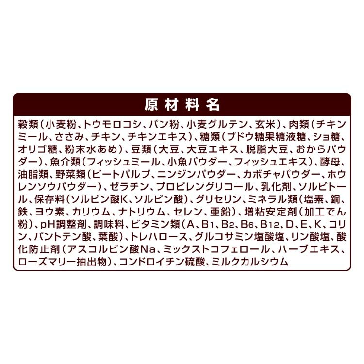 穀類(小麦粉、トウモロコシ、パン粉、小麦グルテン、玄米)、肉類(チキンミール、ささみ、チキン、チキンエキス)、糖類(ブドウ糖果糖液糖、ショ糖、オリゴ糖、粉末水あめ)、豆類(大豆、大豆エキス、脱脂大豆、おからパウダー)、魚介類(フィッシュミール、小魚パウダー、フィッシュエキス)、酵母、油脂類、野菜類(ビートパルプ、ニンジンパウダー、カボチャパウダー、ホウレンソウパウダー)、ゼラチン、プロピレングリコール、乳化剤、ソルビトール、保存料(ソルビン酸K、ソルビン酸)、グリセリン、ミネラル類(塩素、銅、鉄、ヨウ素、カリウム、ナトリウム、セレン、亜鉛)、増粘安定剤(加工でん粉)、pH調整剤、調味料、ビタミン類(A、B1、B2、B6、B12、D、E、K、コリン、パントテン酸、葉酸)、トレハロース、グルコサミン塩酸塩、リン酸塩、酸化防止剤(アスコルビン酸Na、ミックストコフェロール、ハーブエキス、ローズマリー抽出物)、コンドロイチン硫酸、ミルクカルシウム