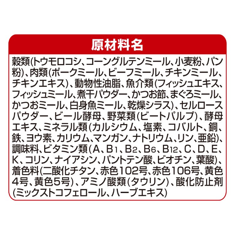 | 穀類(トウモロコシ、コーングルテンミール、小麦粉、パン粉)、肉類(ポークミール、ビーフミール、チキンミール、チキンエキス)、動物性油脂、魚介類(フィッシュエキス、フィッシュミール、煮干パウダー、かつお節、まぐろミール、かつおミール、白身魚ミール、乾燥シラス)、セルロースパウダー、ビール酵母、野菜類(ビートパルプ)、酵母エキス、ミネラル類(カルシウム、塩素、コバルト、銅、鉄、ヨウ素、カリウム、マンガン、ナトリウム、リン、亜鉛)、調味料、ビタミン類(A、B1、B2、B6、B12、C、D、E、K、コリン、ナイアシン、パントテン酸、ビオチン、葉酸)、着色料(二酸化チタン、赤色102号、赤色106号、黄色4号、黄色5号)、アミノ酸類(タウリン)、酸化防止剤(ミックストコフェロール、ハーブエキス) |