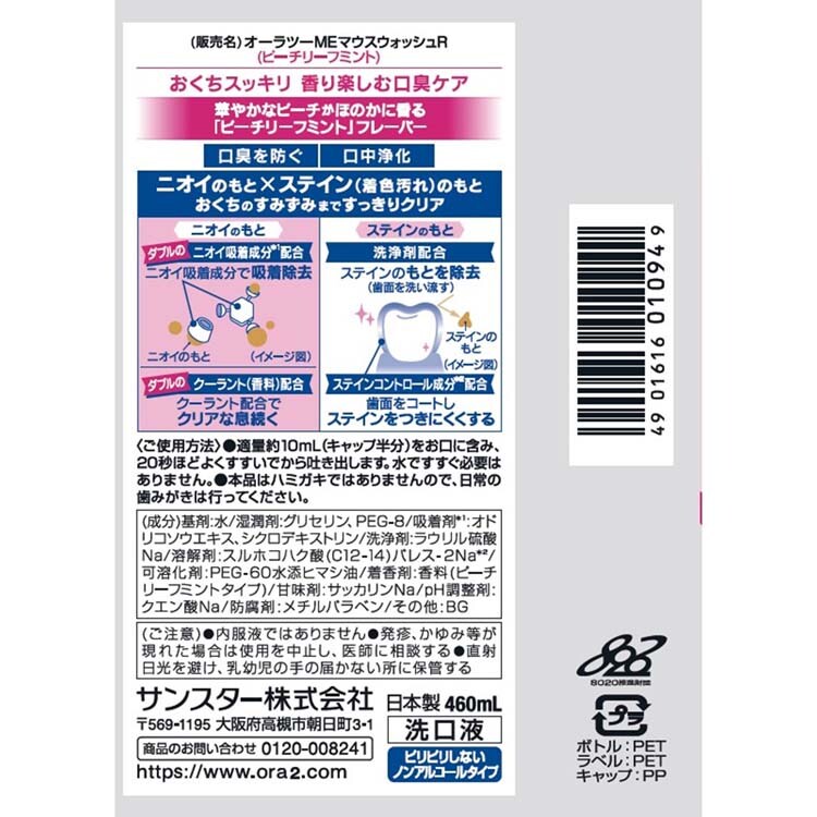 | 基剤:水 湿潤剤:グリセリン、PEG-8 吸着剤:オドリコソウエキス、シクロデキストリン 洗浄剤:ラウリル硫酸Na 溶解剤:スルホコハク酸(C12-14)パレス-2Na 可溶化剤:PEG-60水添ヒマシ油 着香剤:香料(ピーチリーフミントタイプ) 甘味剤:サッカリンNa pH調整剤:クエン酸Na 防腐剤:メチルパラベン その他:BG |