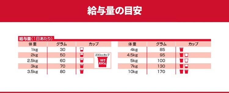 給与量(体重とグラム数)1kg:30g、2kg:50g、2.5kg:60g、3kg:70g、3.5kg:80g、4kg:85g、4.5kg:95g、5kg:100g、7kg:130g、10kg:170g(200ccカップ1杯で約90g)