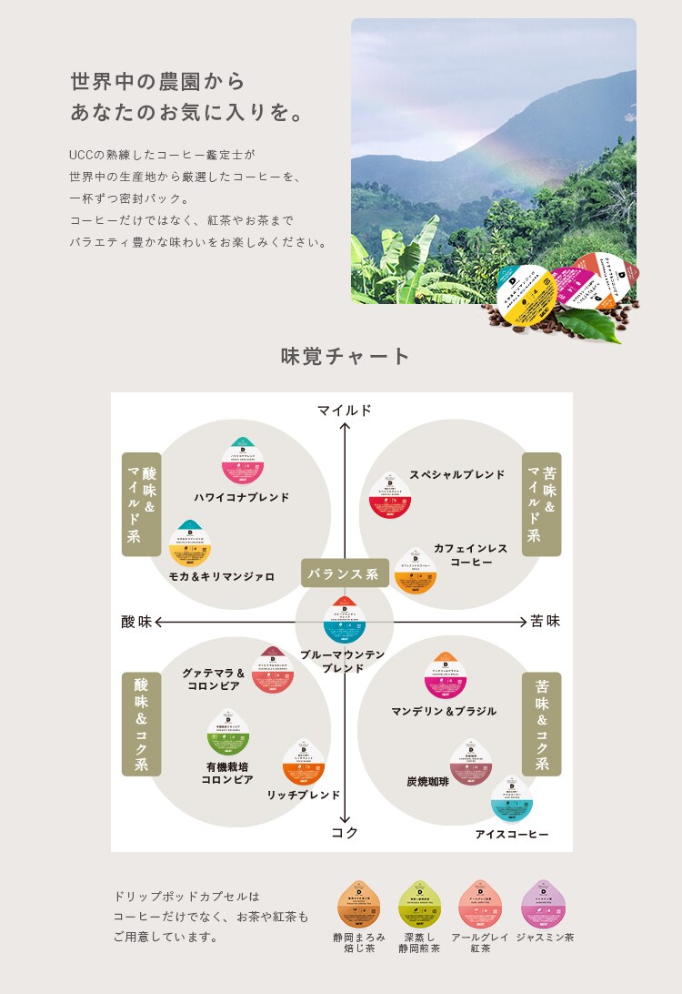 ※本品は「UCC DRIP POD」の専用カプセルです。抽出には「UCC DRIP POD抽出機」(別売)が必要です。