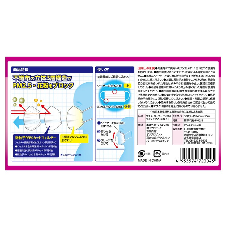 | サイズ:横145*高さ95mm 対象:風邪・花粉・PM2.5 本体外側・フィルタ部:ポリプロピレン 本体内側:ポリプロピレン 耳ひも部:ポリウレタン バー:鉄・ポリエチレン |
