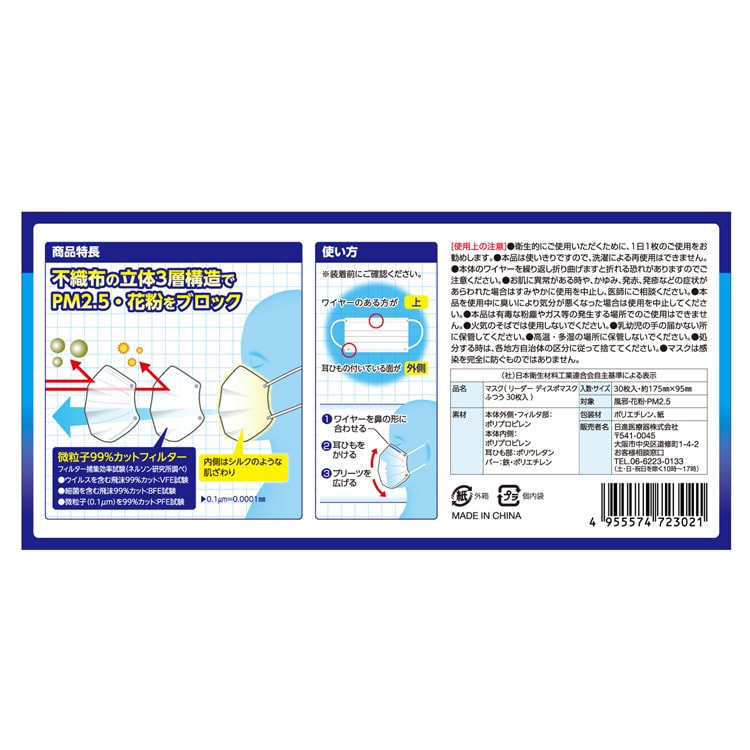 | サイズ:横175*高さ95mm 対象:風邪・花粉・PM2.5 本体外側・フィルタ部:ポリプロピレン 本体内側:ポリプロピレン 耳ひも部:ポリウレタン バー:鉄・ポリエチレン |