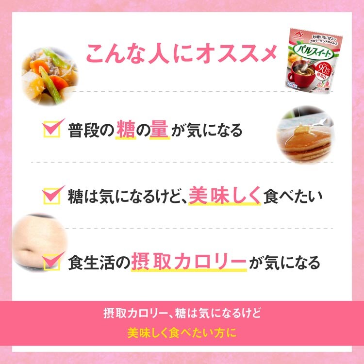 ●パルスイートは、まろやかな甘さでカロリーコントロールができる、カロリー90%カット・糖類ゼロの低カロリー甘味料です。