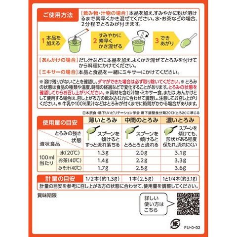 ・食品の種類・温度・量などによって、とろみのつき方や安定するまでの時間が異なります。とろみの状態を確認してからお召し上がりください。