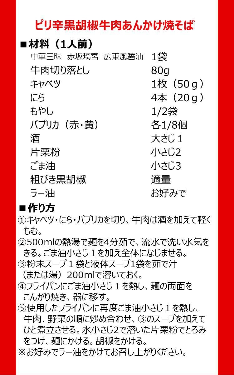 めん(小麦粉(国内製造)、でん粉、植物油脂、食塩)、スープ(しょうゆ、油脂加工品、食塩、糖類、植物油脂、チキンエキス、ビーフ調味料、酵母エキス、香味調味料、チキンオイル、ビーフエキス、香辛料(ガーリック、ペッパー、ジンジャー)、豚脂、たん白加水分解物、XO醤、香味油、オニオン粉末、しいたけエキス、酵母粉末、オイスターソース)/加工デンプン、調味料(アミノ酸等)、増粘多糖類、かんすい、酒精、カラメル色素、香料、酸味料、微粒二酸化ケイ素、カロチノイド色素、(一部に卵・乳成分・小麦・えび・牛肉・ごま・大豆・鶏肉・豚肉・ゼラチンを含む)