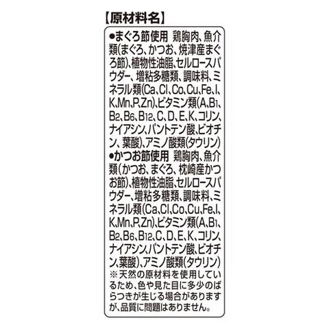 | ★まぐろ節使用:鶏胸肉、魚介類(まぐろ、かつお、焼津産まぐろ節)、植物性油脂、セルロースパウダー、増粘多糖類、調味料、ミネラル類(Ca、Cl、Co、Cu、Fe、I、K、Mn、P、Zn)、ビタミン類(A、B1、B2、B6、B12、C、D、E、K、コリン、ナイアシン、パントテン酸、ビオチン、葉酸)、アミノ酸(タウリン) ★かつお節使用:鶏胸肉、魚介類(かつお、まぐろ、枕崎産かつお節)、植物性油脂、セルロースパウダー、増粘多糖類、調味料、ミネラル類(Ca、Cl、Co、Cu、Fe、l、K、Mn、P、Zn)、ビタミン類(A、B1、B2、B6、B12、C、D、E、K、コリン、ナイアシン、パントテン酸、ビオチン、葉酸)、アミノ酸(タウリン) ※天然の原材料を使用しているため、色や見た目に多少のばらつきが生じる場合がありますが、品質に問題はありません。 |