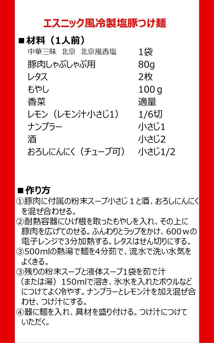 ●蝦醤の深みのある旨みと葱油の香り立ち透明感がありつるっとなめらかな表面:ブランド創世記の中華三昧を彷彿とさせる透明感。弾力・コシのある中心:生麺とも違う中華三昧ならではの食感。スープのりも良くなり、スープとの一体感もアップしたノンフライ麺。