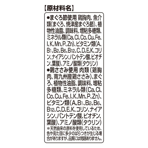 | ★まぐろ節使用:鶏胸肉、魚介類(まぐろ、かつお、焼津産まぐろ節)、植物性油脂、セルロースパウダー、増粘多糖類、調味料、ミネラル類(Ca、Cl、Co、Cu、Fe、I、K、Mn、P、Zn)、ビタミン類(A、B1、B2、B6、B12、C、D、E、K、コリン、ナイアシン、パントテン酸、ビオチン、葉酸)、アミノ酸(タウリン) ★鶏ささみ使用:肉類(鶏胸肉、南九州産鶏ささみ)、魚介類(かつお、まぐろ)、植物性油脂、セルロースパウダー、増粘多糖類、調味料、ミネラル類(Ca、Cl、Co、Cu、Fe、l、K、Mn、P、Zn)、ビタミン類(A、B1、B2、B6、B12、C、D、E、K、コリン、ナイアシン、パントテン酸、ビオチン、葉酸)、アミノ酸(タウリン) ※天然の原材料を使用しているため、色や見た目に多少のばらつきが生じる場合がありますが、品質に問題はありません。 |