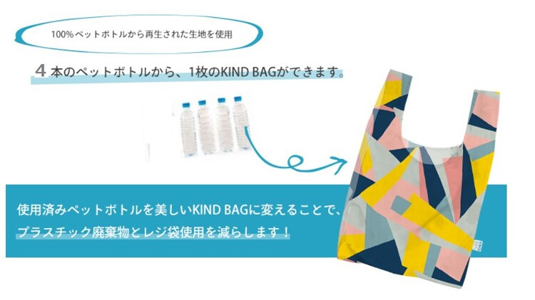 ●KIND BAGは100%使用済みペットボトルを再生した生地で作られたエコバッグです。4本のペットボトルから1枚のKIND BAGができます。環境に優しいKIND BAGを選択することで、レジ袋使用頻度を減らしながらプラスチック廃棄物を削減する一歩にもつながります。