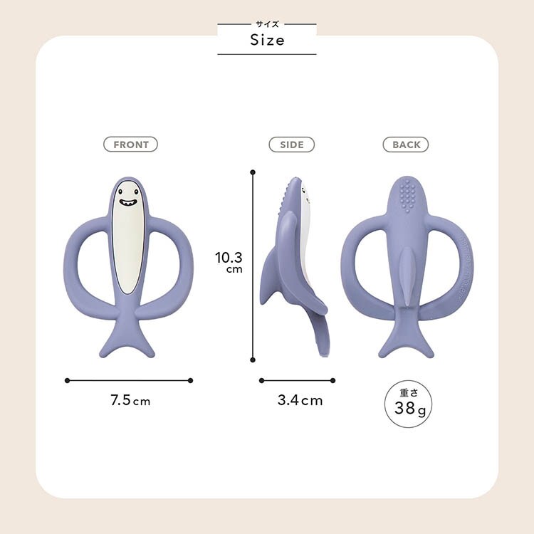 ●アニマルの頭は赤ちゃんが噛みたくなる凹凸付きで、両腕がのど突きを防止しながら歯の生え始めのむずがゆさを刺激します。