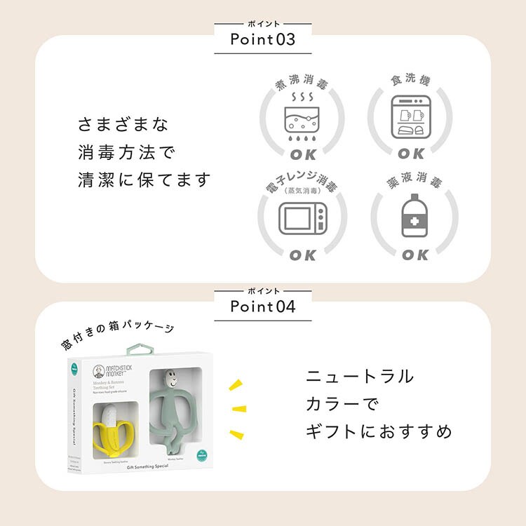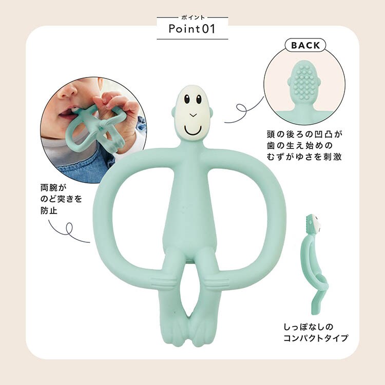 ●柔らかな感触のバナナと、赤ちゃんの歯ぐきのムズムズを刺激するモンキーの2種類を楽しめます。