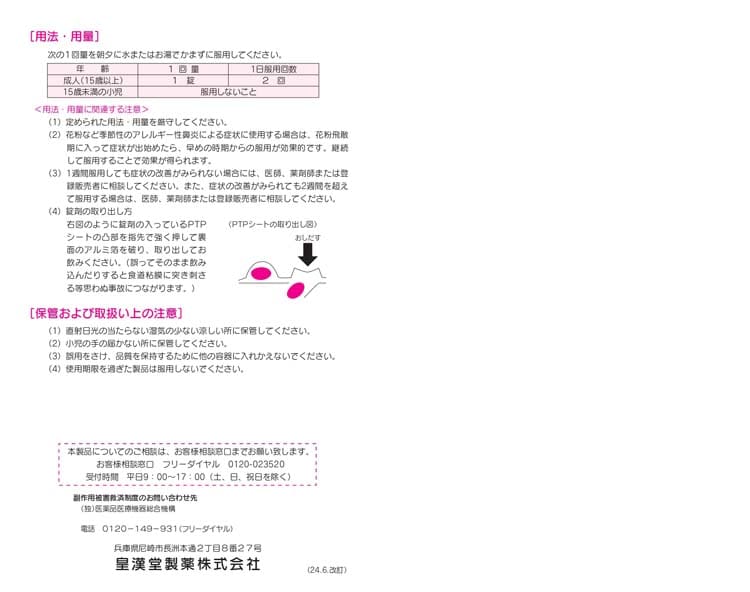 | 花粉、ハウスダスト(室内塵)などによる次のような鼻のアレルギー症状の緩和:くしゃみ、鼻みず、鼻づまり |