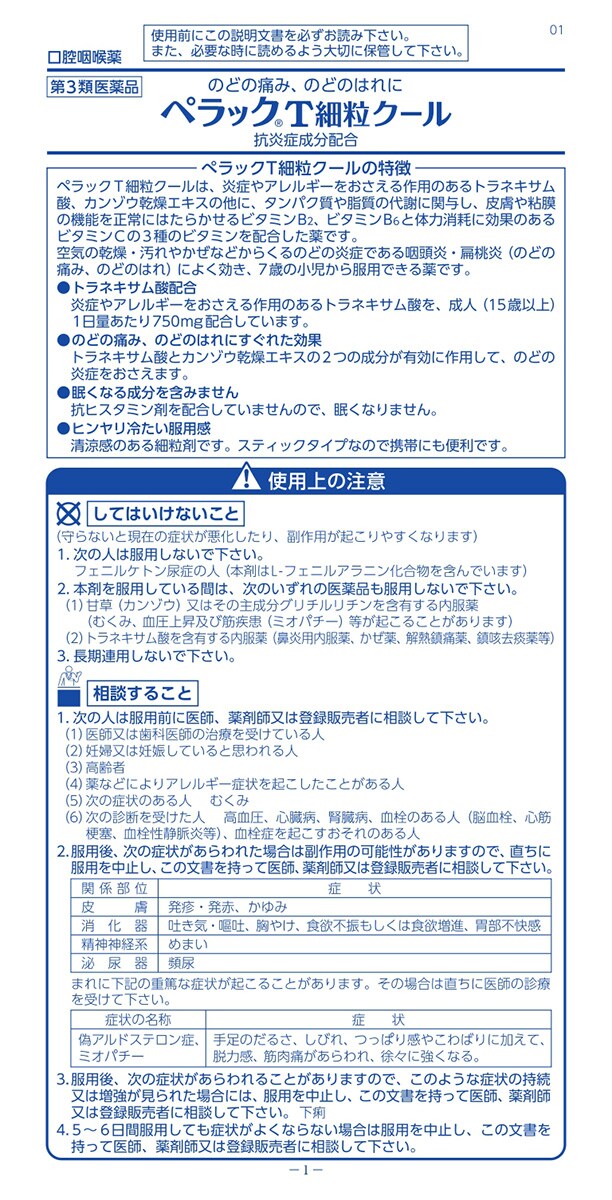 | 本剤は褐色の細粒で、3包(1包 1.3g)中に次の成分を含有しています。 [成分:分量:はたらき] トラネキサム酸:750mg:炎症やアレルギー症状が起こっているとき、体内で異常増加している酵素(プラスミン)をおさえ、口内やのどにおける痛み、はれなどの症状を改善します。 カンゾウ乾燥エキス:198mg(原生薬として990mg):生薬、甘草のエキスで、主成分のグリチルリチン酸は、炎症やアレルギーをおさえる作用があります。 ピリドキシン塩酸塩(ビタミンB6):50mg:皮膚や粘膜の機能を正常にはたらかせる作用があります。 リボフラビン(ビタミンB2):12mg:皮膚や粘膜の機能を正常にはたらかせる作用があります。 L-アスコルビン酸ナトリウム(ビタミンCナトリウム):500mg:皮膚や粘膜の機能を正常にはたらかせる作用があります。 添加物:無水ケイ酸、ステアリン酸Mg、カラメル、エリスリトール、マクロゴール、l-メントール、アスパルテーム(L-フェニルアラニン化合物) ★成分・分量に関連する注意 (1)本剤に配合されているリボフラビン(ビタミンB2)により、尿が黄色になることがあります。 (2)本剤の服用により、尿及び便の検査値に影響を与えることがあります。医師の検査を受ける場合は、ビタミンCを含有する製剤を服用していることを医師に知らせて下さい。 |