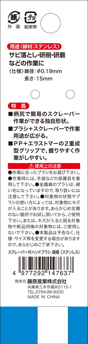 | グリップ部:PP+エラストマー2重成型グリップ ブラシ毛材:ステンレス(径0.19mm*毛丈15mm) (材質)柄:PP・エラストマー ブラシ毛材:ステンレス |