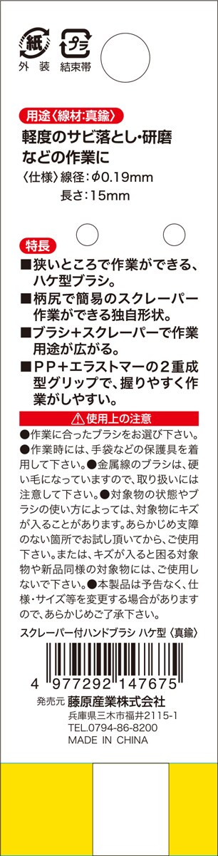 | グリップ部:PP+エラストマー2重成型グリップ ブラシ毛材:真鍮(径0.19mm*毛丈15mm) (材質)柄:PP・エラストマー ブラシ毛材:真鍮 |