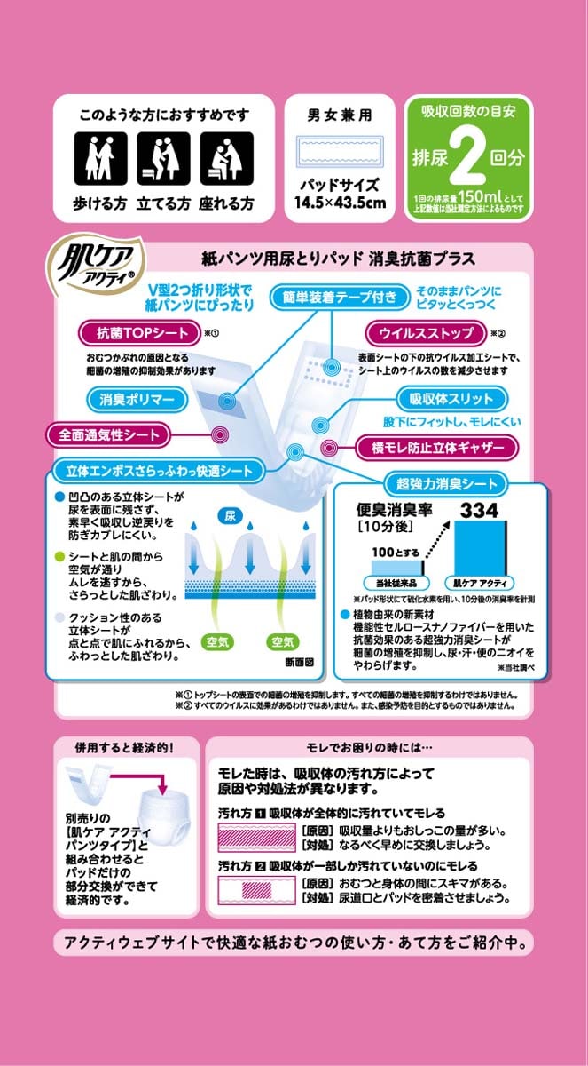 【肌ケアアクティ 大人用おむつ 紙パンツ用尿とりパッド 消臭抗菌プラス 2回吸収の商品詳細】