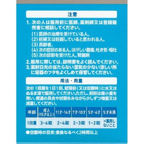 次の1回量を1日1回、就寝前(又は空腹時)に水又はぬるま湯で服用してください。ただし、初回は最小量を用い、便通の具合や状態をみながら少しずつ増量又は減量してください。
