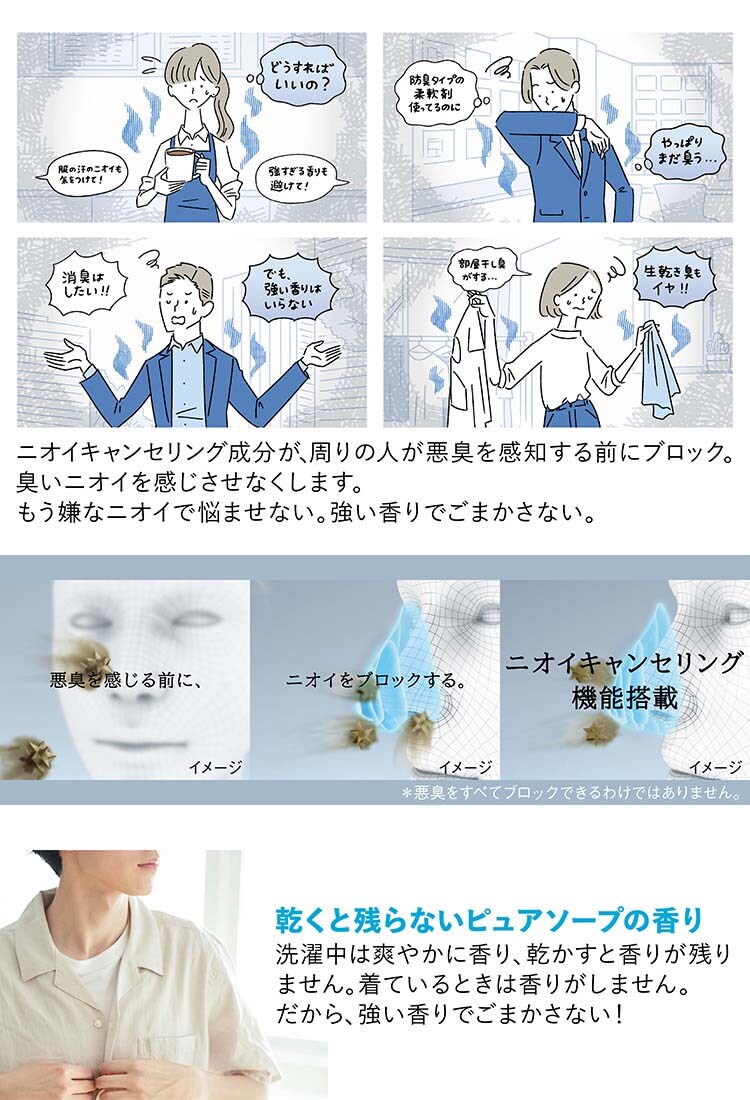 ●嗅覚に着目したニオイキャンセリング機能が、悪臭を感じる前にブロック※します。洗濯中はやさしく香り、着用時には残らないピュアソープの香りで、衣類のニオイや香りによる心配事なく過ごせます。※すべての悪臭を防ぐわけではありません。