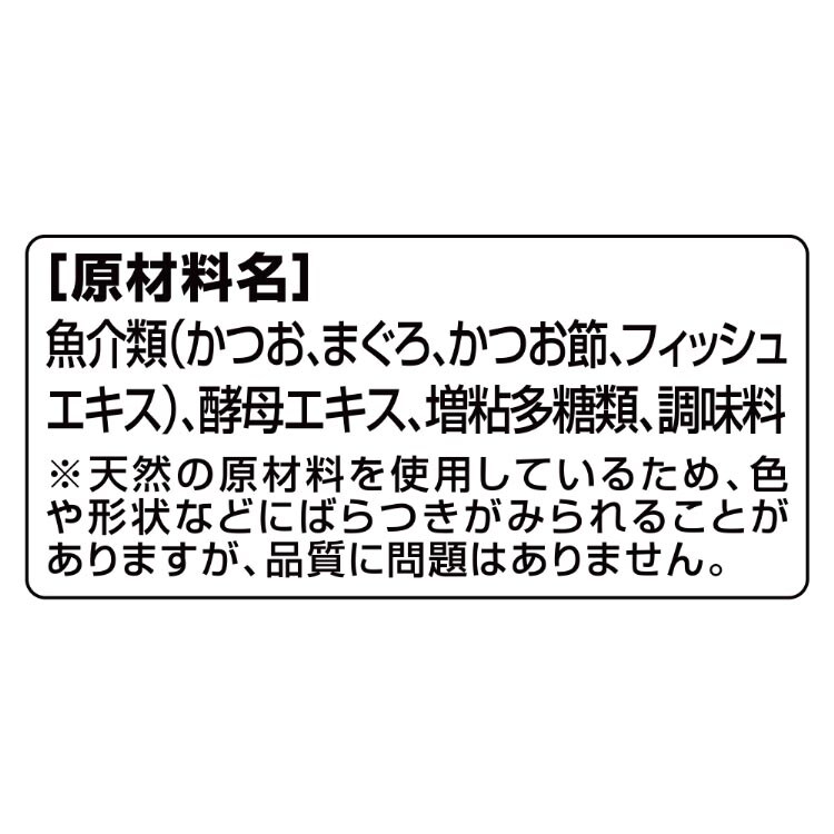 | 魚介類(かつお、まぐろ、かつお節、フィッシュエキス)、酵母エキス、増粘多糖類、調味料※天然の原材料を使用しているため、色や形状などにばらつきがみられることがありますが、品質に問題はありません。 |