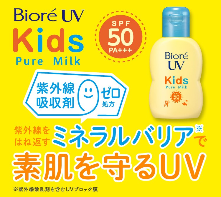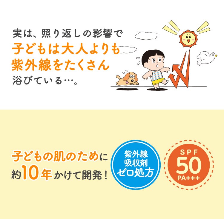 ●SPF50+の紫外線吸収剤ゼロ処方、ミネラルバリア※ で強力紫外線から肌を守るキッズUV。