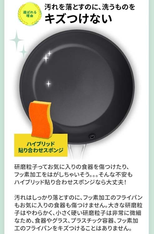 ●ハイブリッド粒子つきの不織布でこびりつきや、コゲ、茶シブまでしっかりおとす。