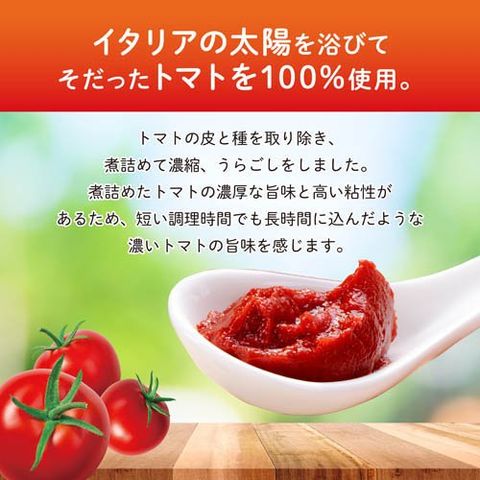 ●煮詰めたトマトの濃厚な旨味と高い粘性があるため、短い調理時間でも長時間に込んだような濃いトマトの旨味を感じます。
