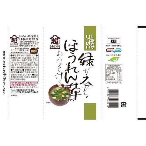 | ほうれん草(国産)、米みそ(大豆を含む)、油揚げ、難消化性デキストリン、かつお昆布だし、豆みそ、でん粉、麦みそ、でん粉分解物、かつお節粉末/増粘多糖類、酸化防止剤(V.E) |