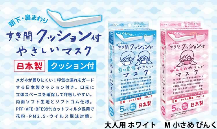 ●メガネが曇りにくい!呼気の漏れをガードするやわらか日本製クッション付マスク。
