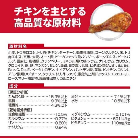 | 小麦、トウモロコシ、トリ肉(チキン、ターキー)、動物性油脂、コーングルテン、米、トリ肉エキス、玄米、大麦、オート麦、ピーカンナッツ殻パウダー、ポークエキス、ビートパルプ、亜麻仁、柑橘類、クランベリー、ミネラル類(カルシウム、ナトリウム、カリウム、クロライド、銅、鉄、マンガン、セレン、亜鉛、ヨウ素)、乳酸、ビタミン類(A、B1、B2、B6、B12、C、D3、E、ベータカロテン、ナイアシン、パントテン酸、葉酸、ビオチン、コリン)、アミノ酸類(メチオニン、タウリン、トリプトファン)、酸化防止剤(ミックストコフェロール、ローズマリー抽出物、緑茶抽出物)、カルニチン |