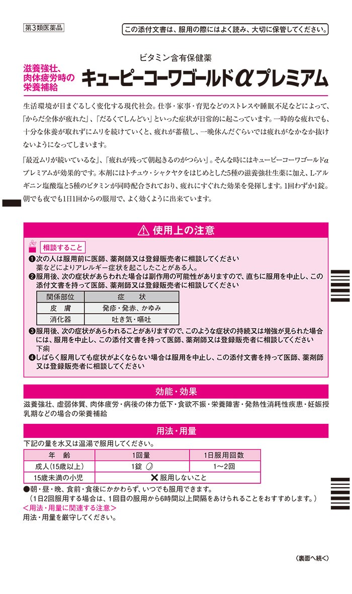●「最近ムリが続いているな」、「疲れが残って朝起きるのがつらい」。そんな時にはキューピーコーワゴールドαプレミアムが効果的です。本剤にはトチュウ・シャクヤクをはじめとした5種の滋養強壮生薬に加え、L-アルギニン塩酸塩と5種のビタミンが同時配合されており、疲れにすぐれた効果を発揮します。1回わずか1錠。朝でも夜でも1日1回からの服用で、よく効くように出来ています。