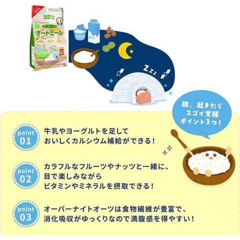 ・既に加熱加工しているので、そのままお召し上がりいただけますが、お粥状に調理するとオートミールが柔らかくなり、消化しやすくなります。