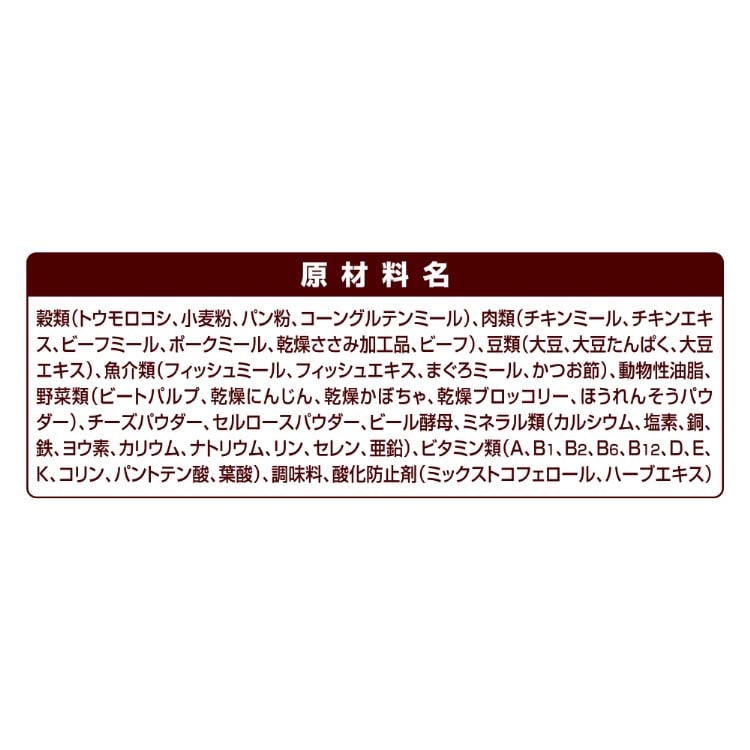 | 穀類(トウモロコシ、小麦粉、パン粉、コーングルテンミール)、肉類(チキンミール、チキンエキス、ビーフミール、ポークミール、乾燥ささみ加工品、ビーフ)、豆類(大豆、大豆たんぱく、大豆エキス)、魚介類(フィッシュミール、フィッシュエキス、まぐろミール、かつお節)、動物性油脂、野菜類(ビートパルプ、乾燥にんじん、乾燥かぼちゃ、乾燥ブロッコリー、ほうれんそうパウダー)、チーズパウダー、セルロースパウダー、ビール酵母、ミネラル類(カルシウム、塩素、銅、鉄、ヨウ素、カリウム、ナトリウム、リン、セレン、亜鉛)、ビタミン類(A、B1、B2、B6、B12、D、E、K、コリン、パントテン酸、葉酸)、調味料、酸化防止剤(ミックストコフェロール、ハーブエキス) |
