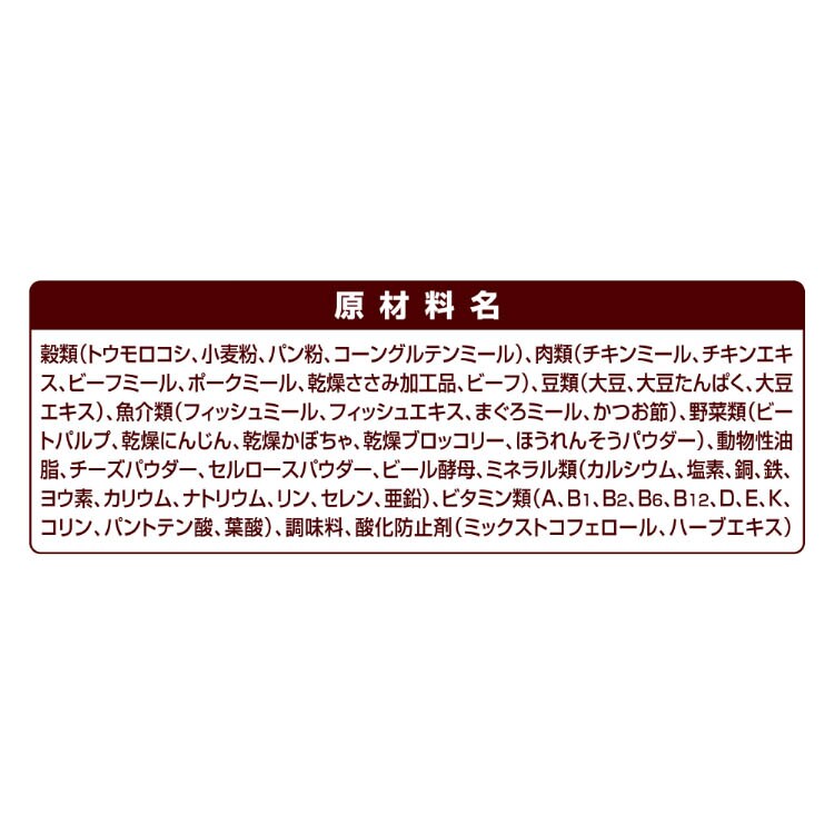 | 穀類(トウモロコシ、小麦粉、パン粉、コーングルテンミール)、肉類(チキンミール、チキンエキス、ビーフミール、ポークミール、乾燥ささみ加工品、ビーフ)、豆類(大豆、大豆たんぱく、大豆エキス)、魚介類(フィッシュミール、フィッシュエキス、まぐろミール、かつお節)、野菜類(ビートパルプ、乾燥にんじん、乾燥かぼちゃ、乾燥ブロッコリー、ほうれんそうパウダー)、動物性油脂、チーズパウダー、セルロースパウダー、ビール酵母、ミネラル類(カルシウム、塩素、銅、鉄、ヨウ素、カリウム、ナトリウム、リン、セレン、亜鉛)、ビタミン類(A、B1、B2、B6、B12、D、E、K、コリン、パントテン酸、葉酸)、調味料、酸化防止剤(ミックストコフェロール、ハーブエキス) |