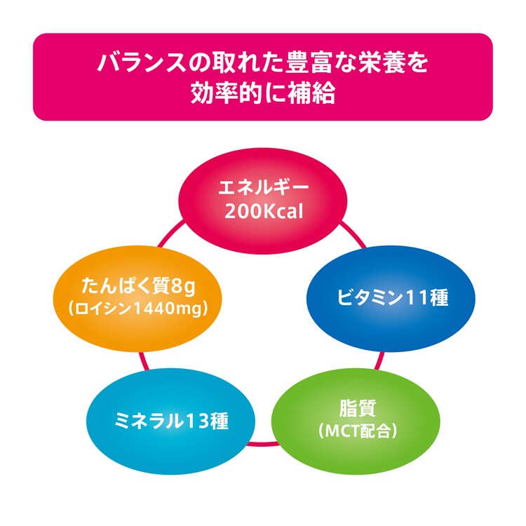 | 1パック(100ml)あたり エネルギー:200kcal、たんぱく質:8.0g、脂質:10.3g、炭水化物:20.4g、食塩相当量:0.3g、ビタミンD:20.0μg 分岐鎖アミノ酸(BCAA):2070mg(ロイシン:1440mg、バリン:360mg、イソロイシン:270mg)、中鎖脂肪酸:3.3g、水分:70g |