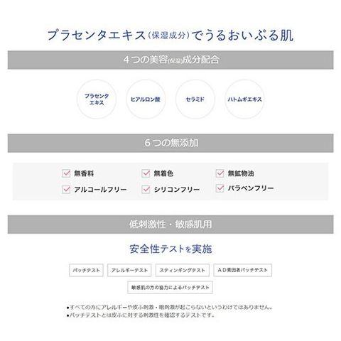 | 水、グリセリン、BG、DPG、パルミチン酸エチルヘキシル、プラセンタエキス、加水分解ヒアルロン酸、セラミドNG、ハトムギ種子エキス、(アクリレーツ/アクリル酸アルキル(C10-30))クロスポリマー、フェノキシエタノール、カルボマー、水酸化Na、エチルヘキシルグリセリン、ペンテト酸5Na、トコフェロール、PPG-4セテス-20 |