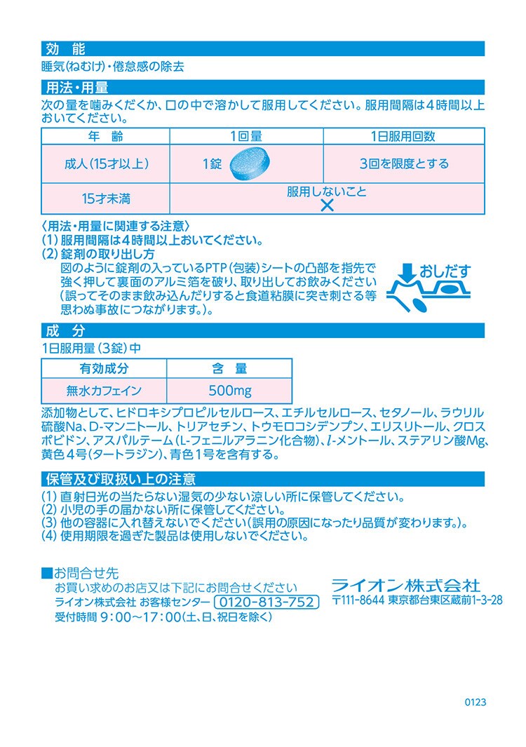 | 1日服用量(3錠)中 [有効成分:含量] 無水カフェイン:500mg 添加物として、ヒドロキシプロピルセルロース、エチルセルロース、セタノール、ラウリル硫酸Na、D-マンニトール、トリアセチン、トウモロコシデンプン、エリスリトール、クロスポビドン、アスパルテーム(L-フェニルアラニン化合物)、l-メントール、ステアリン酸Mg、黄色4号(タートラジン)、青色1号を含有する。 |