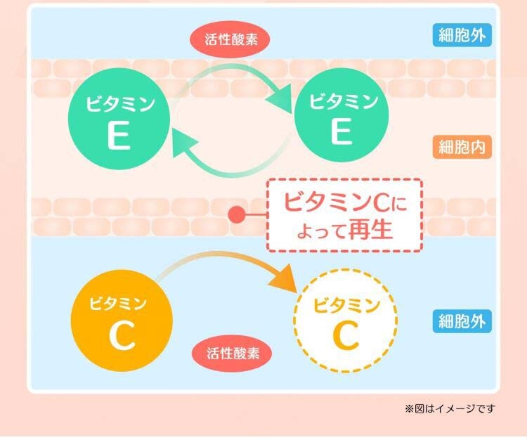 | 成人1日量3包(3.6g)中に次の成分を含みます。 [成分:含量] トコフェロール酢酸エステル(ビタミンE):300mg アスコルビン酸(ビタミンC):600mg 添加物:コムギデンプン、ヒドロキシプロピルセルロース、香料、還元麦芽糖水アメ、ビタミンB2 ★成分に関連する注意 ビタミンCの服用により、尿及び大便の検査値に影響をおよぼすことがありますので、尿及び大便の検査を受ける場合には、本剤を服用していることを医師にお知らせください。 |