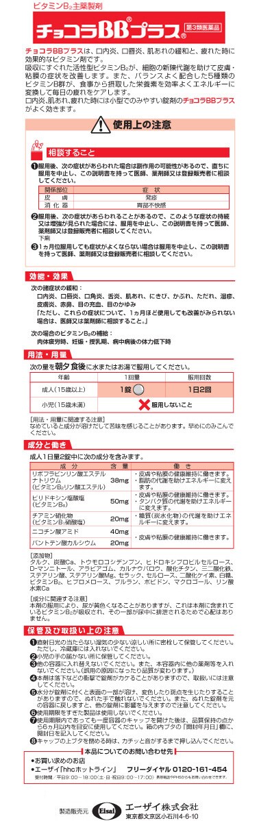 ●チョコラBBプラスは、肌あれ、にきび・吹き出物、口内炎の緩和と、疲れた時に効果的なビタミン剤です。