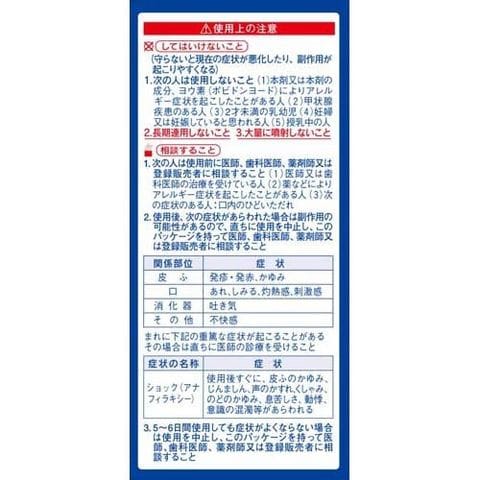 | 100mL中 ヨウ素:0.5g 添加物として、ヨウ化K、グリセリン、プロピレングリコール、D-ソルビトール、エタノール、l-メントール、香料を含有する |
