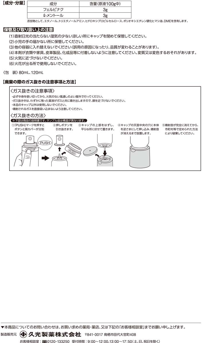 ●優れた抗炎症、鎮痛効果が認められている成分「フェルビナク」3.0%と血液の循環をよくする成分「l-メントール」3.0%を配合した鎮痛消炎スプレー剤です。