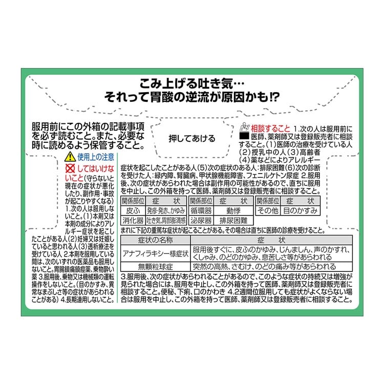 | ・胃痛、胸やけ、胃酸過多、胃部不快感、胃部膨満感、もたれ(胃もたれ)、胃重、胸つかえ、げっぷ(おくび)、はきけ(むかつき、胃のむかつき、二日酔・悪酔のむかつき、嘔気、悪心)、嘔吐、飲み過ぎ(過飲) |