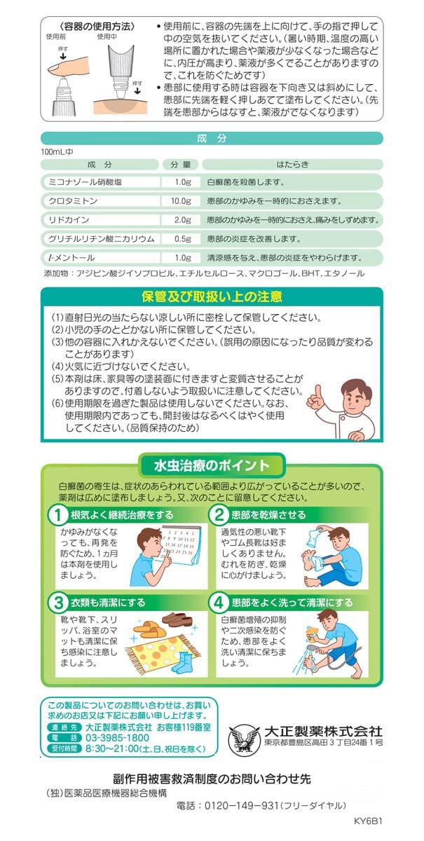 | 100mL中 ミコナゾール硝酸塩:1.0g クロタミトン:10.0g リドカイン:2.0g グリチルリチン酸ニガリウム:0.5g L-メントール:1.0g 添加物:アジアン酸ジイソプロピル、エチルセルロース、マクロゴール、BHT、エタノール |