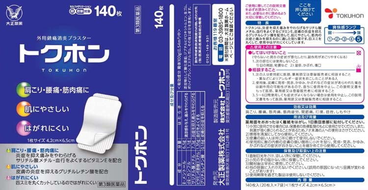 ●トクホンは、炎症を抑え痛みをやわらげるサリチル酸メチル、血行をよくするビタミンE、皮膚の炎症を抑えるグリチルレチン酸を配合して、肌にやさしく、筋肉の炎症と痛みを抑えるのに適した貼り薬です。四スミを丸くして、使用中はがれにくくしています。