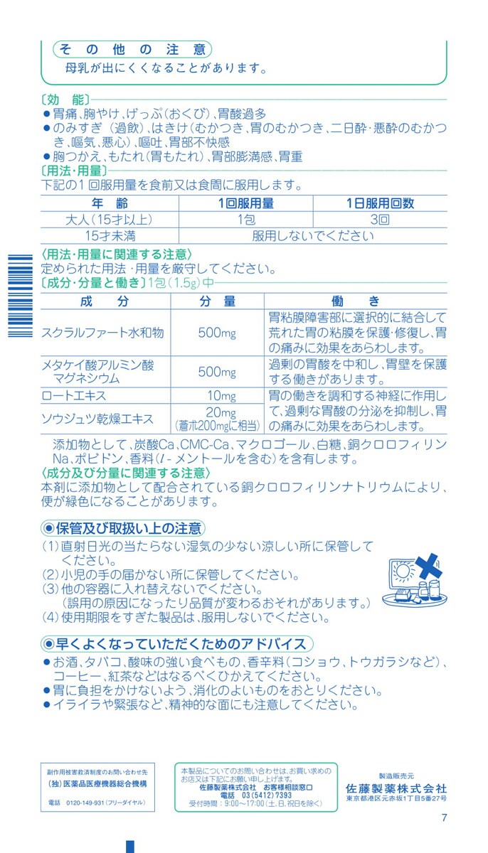 | (1包(1.5g)中) スクラルファート水和物:500mg メタケイ酸アルミン酸マグネシウム:500mg ロートエキス:10mg ソウジュツ乾燥エキス:20mg(蒼朮200mgに相当) 添加物として、炭酸Ca、CMC-Ca、マクロゴール、白糖、銅クロロフィリンNa、ポピドン、香料(L-メントールを含む)を含有します。 ★成分及び分量に関連する注意 ・本剤に添加物として配合されている銅クロロフィリンナトリウムにより、便が緑色になることがあります。 |