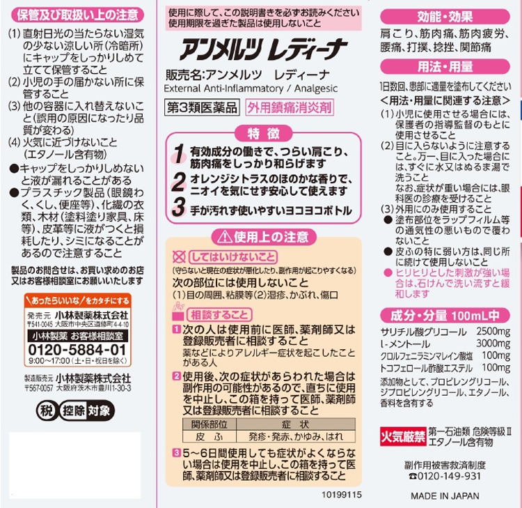 | 100mL中 成分:分量 サリチル酸グリコール:2500mg l-メントール:3000mg クロルフェニラミンマレイン酸塩:100mg トコフェロール酢酸エステル:100mg 添加物としてプロピレングリコール、ジプロピレングリコール、エタノール、香料を含有する |