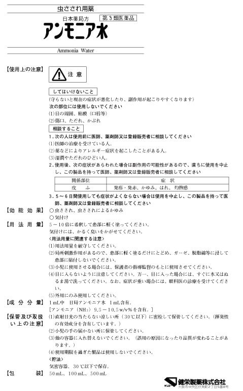 | (1mL中) 日局アンモニア水1mL含有(アンモニア(NH3) 9.5~10.5w/v%を含有。) |