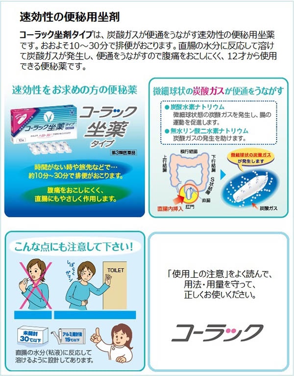 ●コーラック坐薬タイプは、炭酸ガスが便通をうながす速効性の便秘用坐薬です。おおよそ10~30分で排便がおこります。