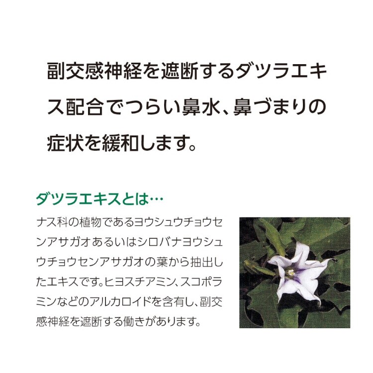 ●ダツラエキスは、鼻汁分泌を抑え、鼻水などの鼻炎症状に効果をあらわします。