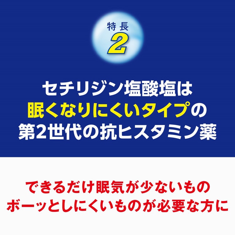 | 1カプセル中 セチリジン塩酸塩:10mg 添加物として、マクロゴール、水酸化 K、ゼラチン、コハク化ゼラチン、グリセリン、トウモロコシデンプン由来糖アルコール、三二酸化鉄を含有します。 |